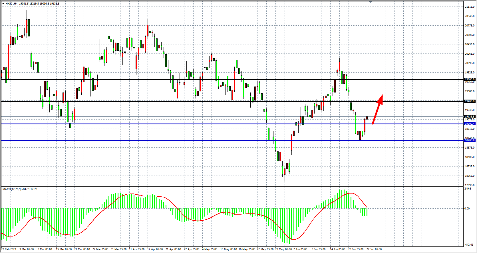 4小时图看,恒指反弹突破19000点,MACD量能维持在零轴之下,趋势出现反弹动能,支撑关注19000-18700,压力19400-19800。