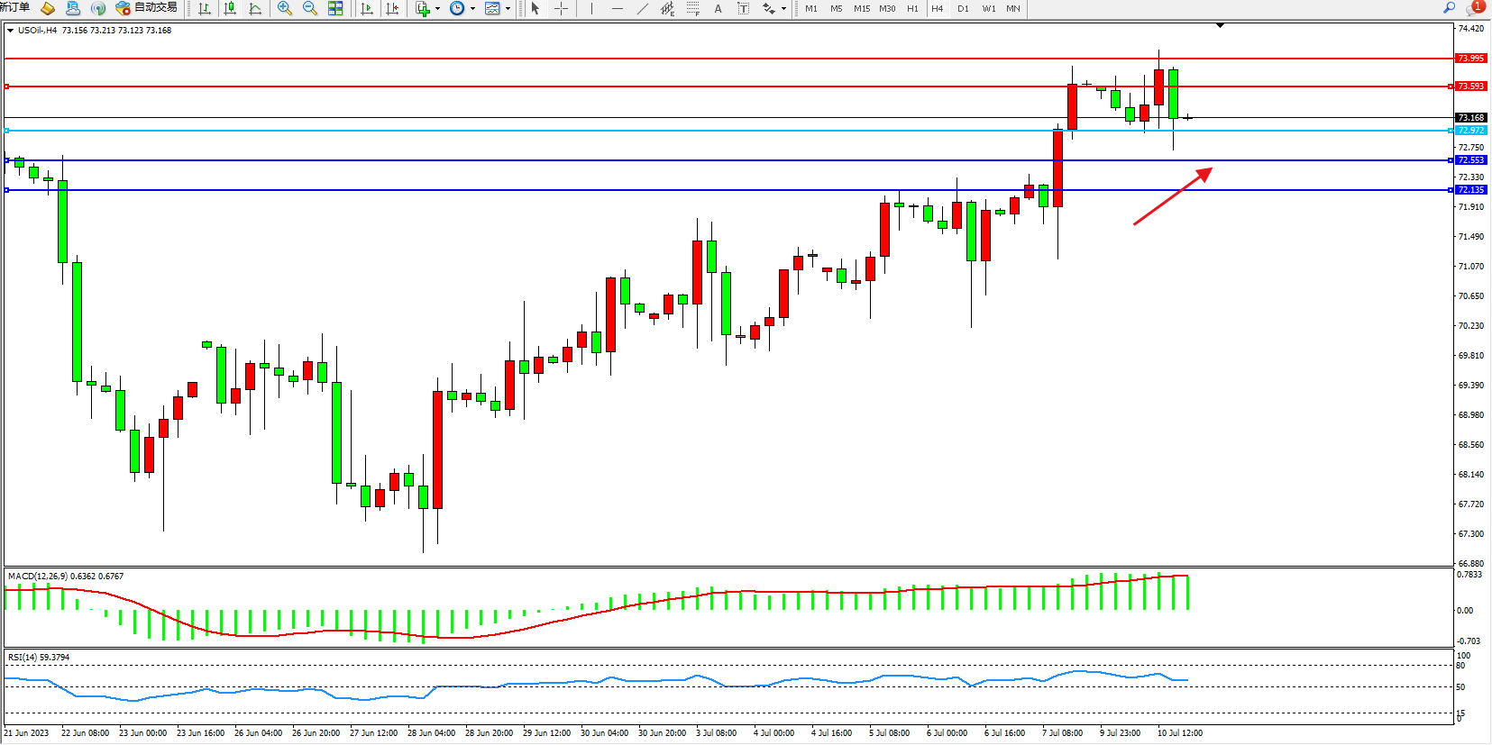 原油USOil——4小时K线图显示: