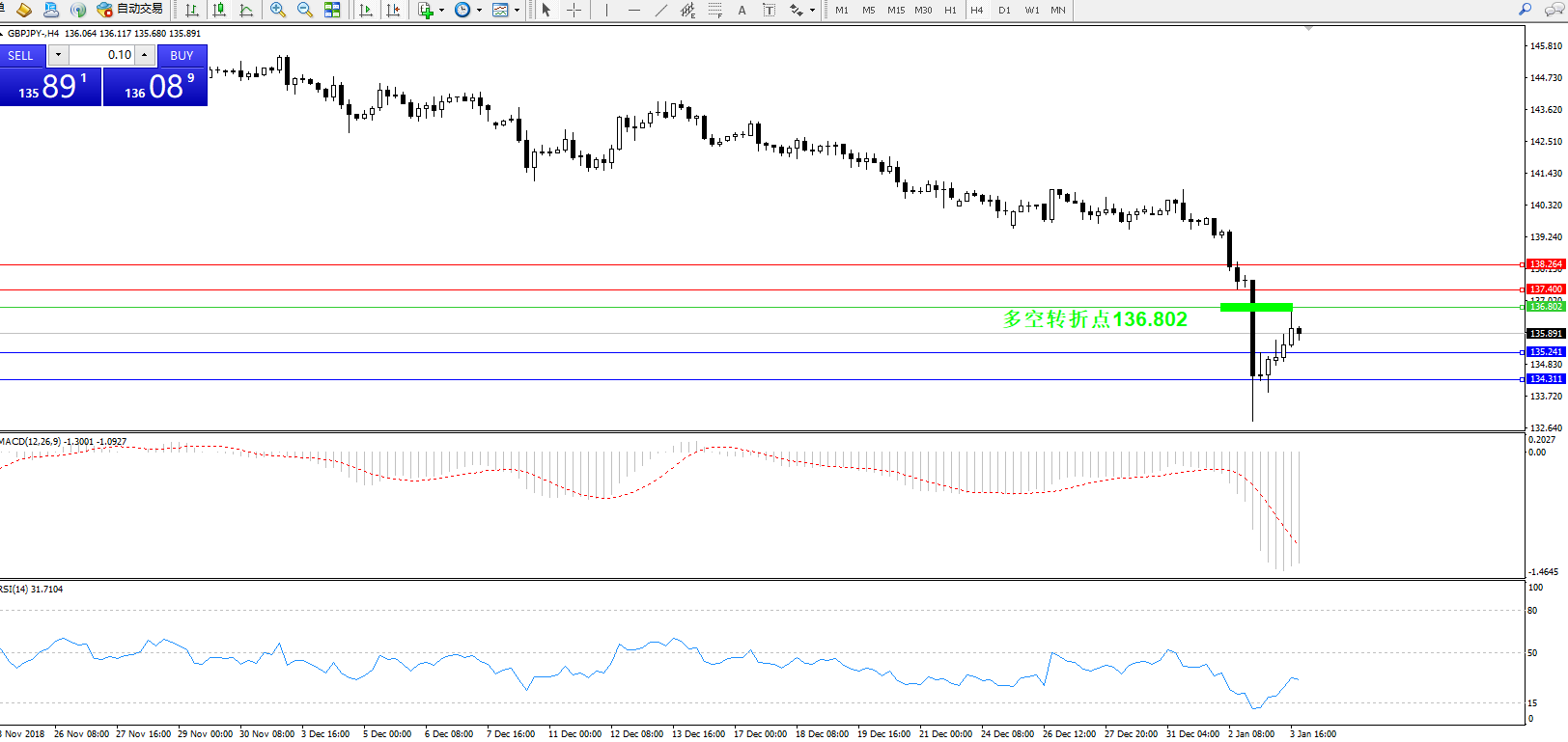 交易策略:136.802下方看跌,目标135.241、134.311